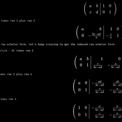 Inverts a generic \(2\times 2\) matrix step-by-step by doing Gauss-Jordan elimination on the matrix augmented with the identity. You can do the same on a \(3\times 3\) or larger matrix by doing a similar process.