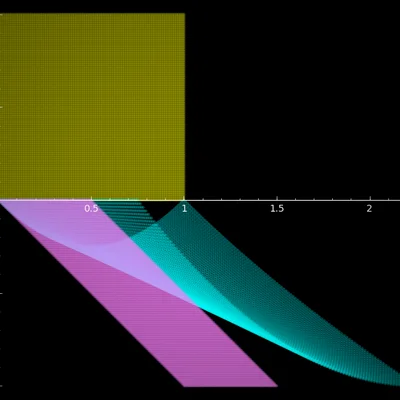 The code takes a function \(f\) that maps \(\mathbb{R}^2\) to \(\mathbb{R}^2\) and draws three regions: the unit cube in blue, the image of the unit cube under \(f\) in red, and the linearization of the image by Jacobian of \(f\) at the origin.